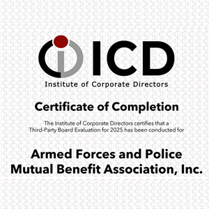 Armed Forces and Police Mutual Benefit Association, Inc. (AFPMBAI) is pleased to announce the successful completion of its Third-Party Board Evaluation for 2025, conducted by the Institute of Corporate Directors (ICD). This assessment reinforces AFPMBAI’s commitment to strong corporate governance, accountability, and continuous improvement in board effectiveness.