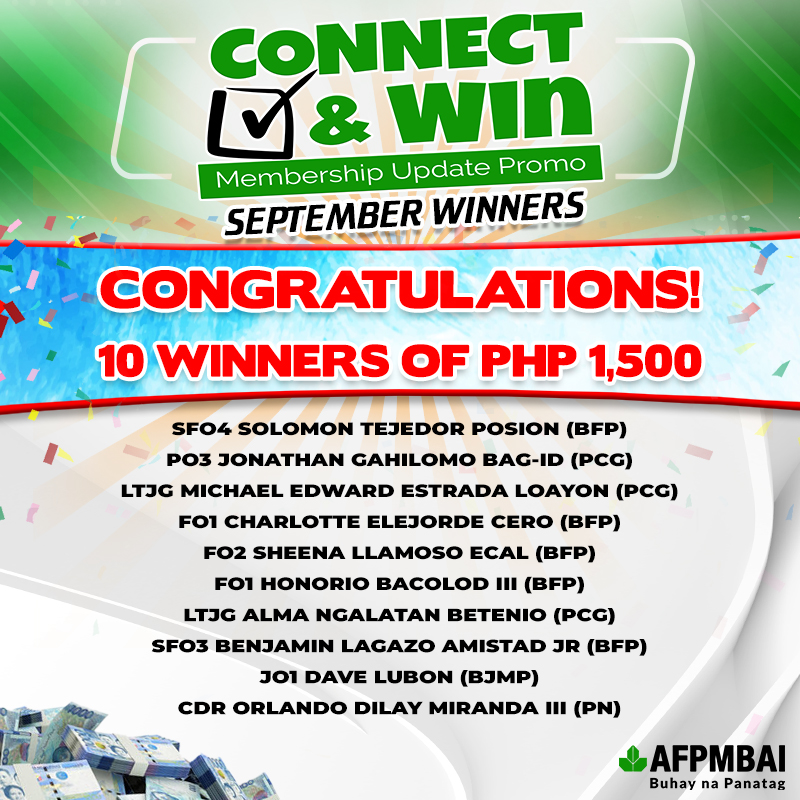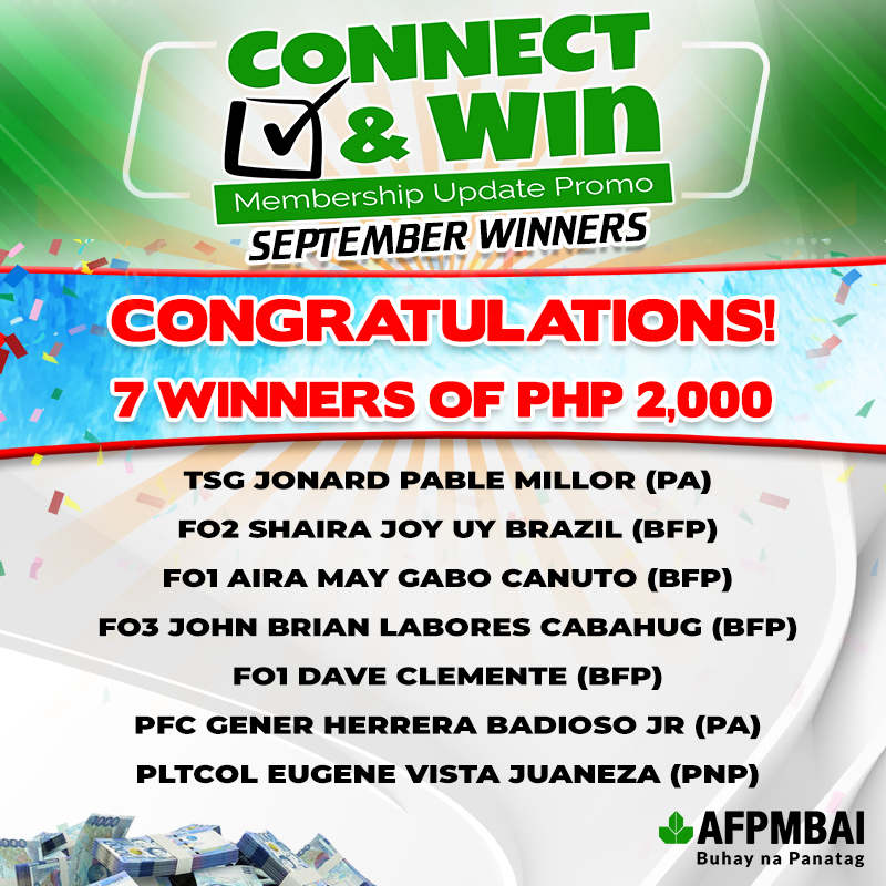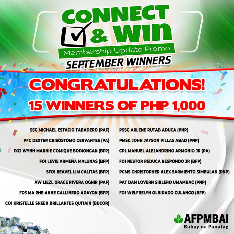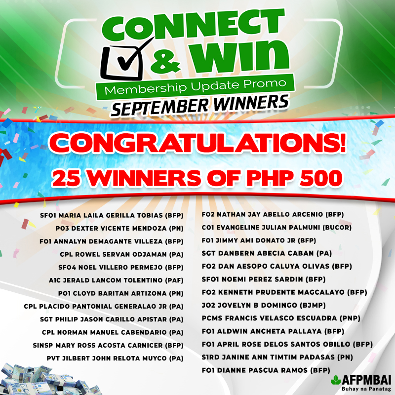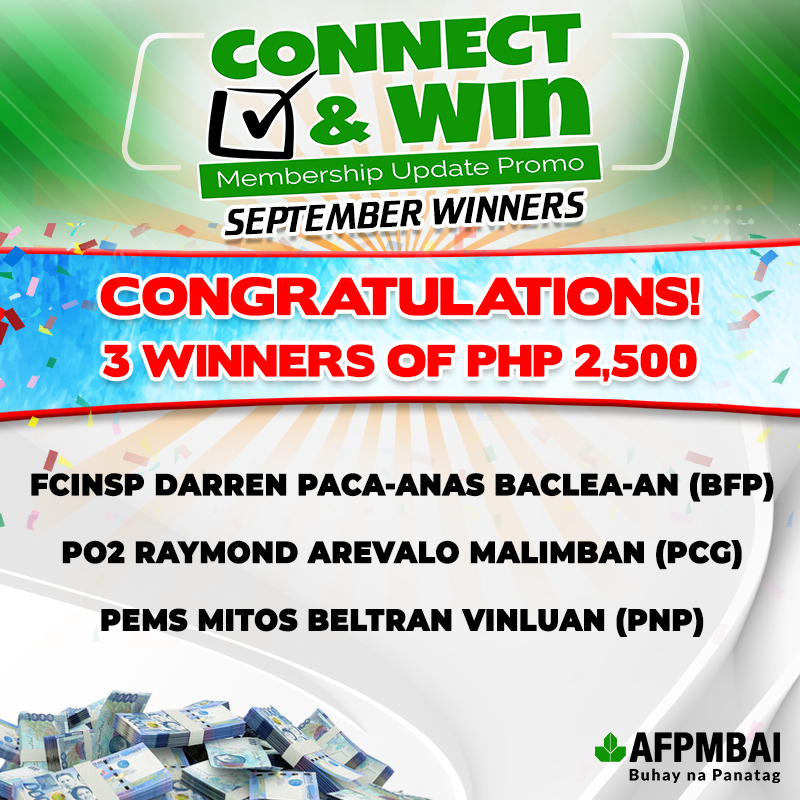 Congratulations to our September winners, you will receive a message from our official AFPMBAI account shortly. Thank you for joining our Connect & Win Promo and for taking the time to update your membership information!